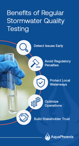 Proper monitoring of stormwater can hold many benefits for the community and the permit holder. Permit holders will prevent costly fines and poor public image in the community. It can also prevent unnecessary damage to equipment and infrastructure. Everyone within the community will benefit from a healthier environment with cleaner waterways.
